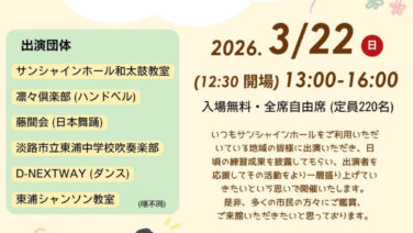 サンシャインホールでふれあいフェスティバル淡路市立サンシャインホールで、地域でつながる交流イベント「ふれあいフェスティバル」が2026年3月22日(日)に開催されます!地域で活動する6団体が日ごろの練習成果を披露します。入場無料。全席自由席...