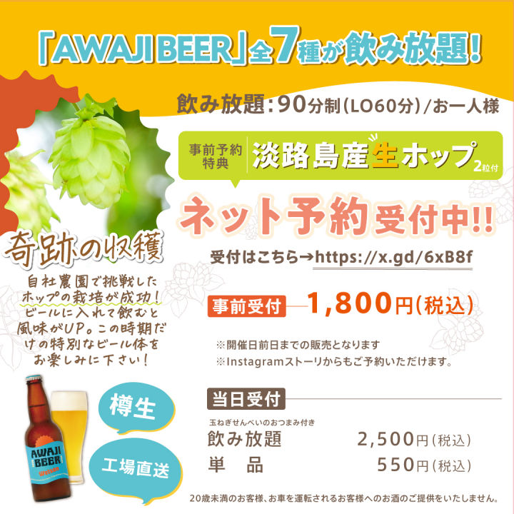 - 事前予約:1,800円(淡路島産生ホップ2粒プレゼント付)