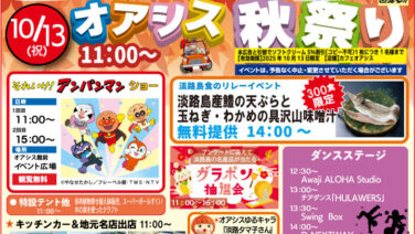 イベント 「オアシス秋祭り2025」淡路ハイウェイオアシスで10/13開催|淡路島イベント オアシス秋祭り2025淡路ハイウェイオアシスで、2025年10月13日(月祝)に「オアシス秋祭り2025」が開催されます。アンパンマンショーやダンスステージのほか、アンケートに答えて淡路島の名産品が当たる「ガラポン抽選会」、オアシスのゆるキ... 2025.09.30 イベント
